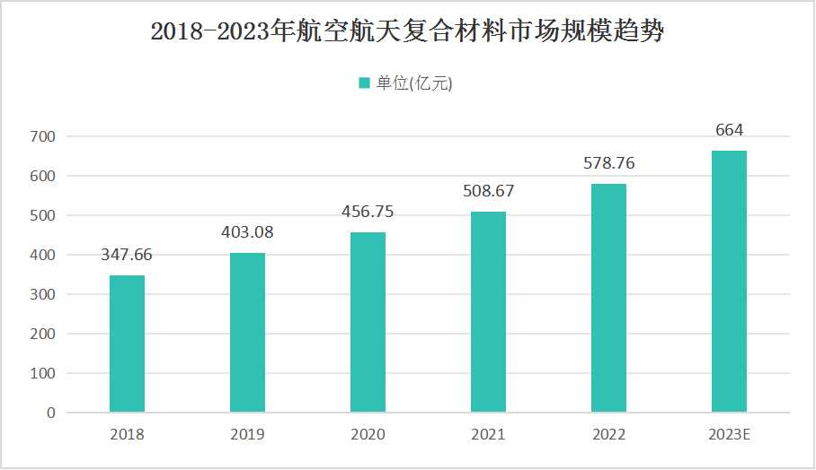 据中研普华产业研究院发布的《2023-2028年中国航空复合材料行业市场发展现状调研及投资前景预测报告》显示,2022年中国航空航天复合材料市场规模达到了578.76亿元。在过去的2018-2022年,其年均复合增长率高达13.59%。预计到2023年,中国航空航天复合材料市场规模将进一步扩大至664亿元。