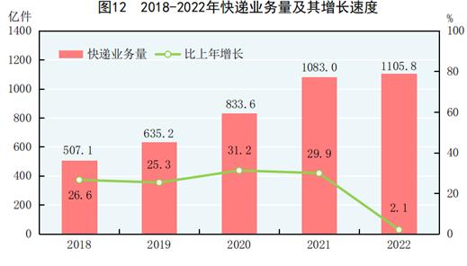 尽管近年来中国快递业务量快速增长,但市场逐渐趋向饱和,增长速度有所放缓。2022年全国快递业务量达到了1105.8亿件,同比增长了2.11%,相较于2021年同步增长的28.92%有所放缓。