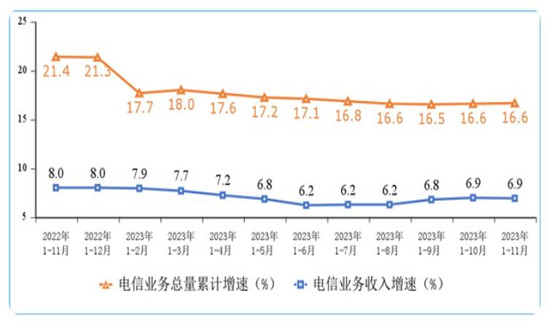 2023年1-11月份,电信业务收入增长稳定,电信业务总量较快增长;5G、千兆光网、物联网等新型基础设施建设加快,网络连接终端用户规模不断扩大;云计算等新兴业务拉动作用持续增强,助推行业高质量发展。