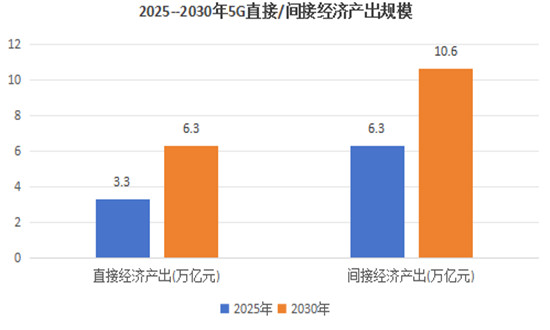 根据信通院《5G经济社会影响白皮书》数据,2025年预计带动当年直接经济产出3.3万亿元,间接产出6.3万亿元,主要来自5G商用中期终端用户及电信服务支出的增加;预计到2030年,5G将带动我国当年直接经济产出为6.3万亿,间接产出10.6万亿,主要来自5G商用成熟期5G信息服务及互联网企业服务收入。