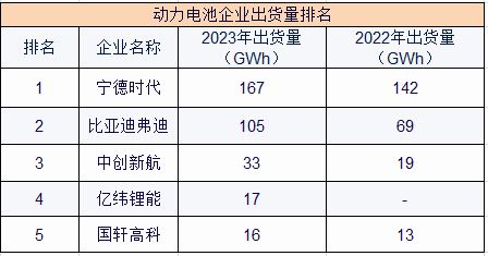 这一排名在2022年分别为宁德时代、比亚迪弗迪、中创新航、国轩高科、欣旺达,出货量分别为142GWh、69GWh、19GWh、13GWh、8GWh。