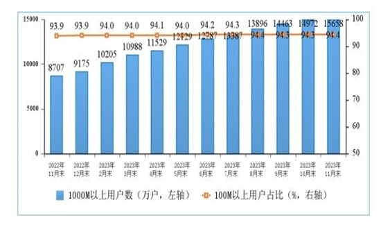 数据显示,截至11月末,中国移动、中国电信和中国联通3家基础电信企业的固定互联网宽带接入用户总数达6.36亿户,比上年末净增4621万户。其中,100兆宽带及以上接入速率的固定互联网宽带接入用户达6亿户,占总用户数的94.4%,占比较上年末提升0.5个百分点;1000兆宽带及以上接入速率的固定互联网宽带接入用户达1.57亿户,比上年末净增6483万户,占总用户数的24.6%。
