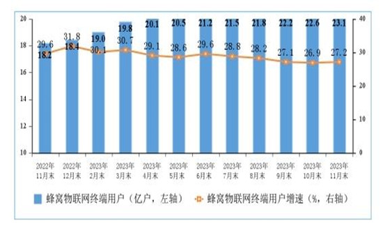 移动电话用户数稳中有增,5G用户规模加速扩大。截至11月末,3家运营商的移动电话用户总数达17.26亿户,比上年末净增4269万户。其中,5G移动电话用户达7.71亿户,比上年末净增21040万户,占移动电话用户总数的44.7%,占比较上年末提高11.4个百分点。