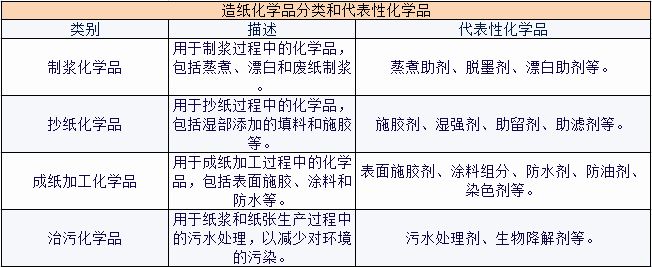 制浆化学品:包括蒸煮过程化学品、漂白过程化学品和废纸制浆过程化学品。如蒸煮助剂、脱墨剂、漂白助剂等。