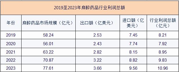 随着医疗行业的发展,麻醉药品在手术中扮演着越来越重要的角色。因此,麻醉药品行业也得到了快速发展。2019年,我国麻醉药品市场规模为58.24亿元,2020年为56.01亿元,2021年为63.22亿元,2022年为70.87亿元,2023年约为77.61亿元。2019年至2023年,我国麻醉药品出口额分别为2.53亿美元、2.43亿美元、2.82亿美元、3.22亿美元和3.66亿美元。2019年至2023年,我国麻醉药品进口额分别为7.45亿美元、7.74亿美元、8.15亿美元、8.82亿美元和9.56亿美元。2019年至2023年,我国麻醉药品行业利润总额分别为8.21亿元、7.92亿元、8.95亿元、9.83亿元和10.96亿元。