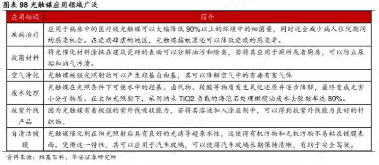 光触媒在环保、消杀、防晒等领域有广泛应用。例如,光触媒能有效地降解空气中有毒有害气体如甲醛等,高效净化空气;同时,能够有效杀灭多种细菌,并能将细菌或真菌释放出的毒素分解及无害化处理。光触媒材料常用的有N型半导体材料,如二氧化钛等。早在20世纪30年代就已经发现了以氧化锌为基底的光触媒材料,而Garey等人在1976年开拓了光触媒在环保领域的应用,利用光催化降解水中污染物。此外,“光呼吸”光触媒是一种高性能、多功能空气净化产品,它选用天然极性矿物材料、纳米材料、无机抗菌材料等材料复合而成,具有持久的有害气体消除能力,并且具有发射远红外线、释放羟基负离子、高效抗菌等多项功能。