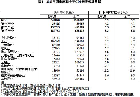 初步核算,2023年全年国内生产总值1260582亿元,按不变价格计算,比上年增长5.2%。1月17日,国家统计局局长康义在新闻发布会上表示,观察中国经济的表现,不仅要跟自己纵向比,也要跟其他国家横向比。2023年我国5.2%的经济增速不仅高于全球3%左右的预计增速,在世界2