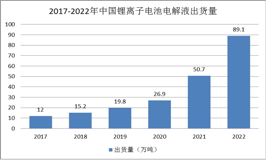 2022年,全球锂离子电池电解液出货量突破百万吨,达到104.3万吨,同比增长70.4%。中国电解液出货量同比增长75.7%,达到89.1万吨,在全球电解液中的占比增长至85.4%。得益于中国电解液企业大规模的扩产,未来中国企业电解液出货量全球占比将进一步提升。