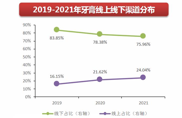 根据2021年的数据,中国的牙膏市场整体销售额为339.8亿元,较上年增长0.86%。其中,线下销售额所占比例达到75.96%,占据主导地位。而线上销售额则占比24.04%,较上年增加了7.89个百分点,呈现出持续增长的趋势。