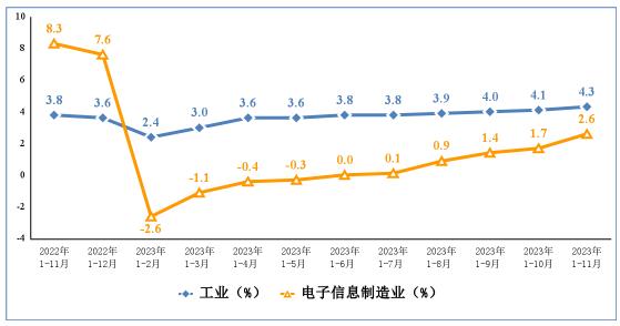 1—11月份,规模以上电子信息制造业增加值同比增长2.6%,增速较1—10月份提高0.9个百分点;增速比同期工业低1.7个百分点,比高技术制造业高0.3个百分点。11月份,规模以上电子信息制造业增加值同比增长10.6%。