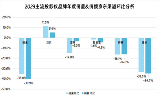 京东平台上投影机市场的年度销量为200万+,同比下滑约8%;销售额为47亿+,同比下滑约13%。同时,天猫平台上投影机市场的年度销量约340万,销售额约72亿。鲸参谋平台同时发布各大主流品牌的销量销额环比数据,据分析极米投影销量环比下降35%、销额环比下降39.9%;当贝投影销量&销额环比增长第一,分别为11.5%和5.4%,也是众多投影仪品牌中逆势增长TOP.1