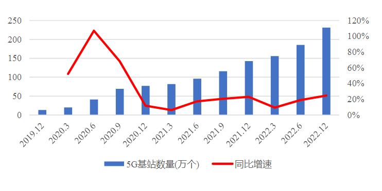 从下游移动基站领域来看,截至2022年底,全国移动通信基站总数已达到1083万个,全年净增87万个。其中,5G基站的数量为231.2万个,全年新建5G基站88.7万个,占移动基站总数的21.3%,占比较2021年末提升7个百分点。这一数据表明,随着5G技术的不断发展和普及,5G基站建设正在加速推进,这将进一步促进基站天线市场的需求增长和技术创新。