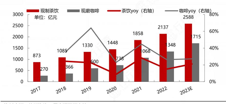 饮品店行业也呈现出蓬勃发展的态势。随着消费者需求的多样化和个性化,饮品店行业提供了丰富的选择。总体市场规模从2017年的人民币1152亿元增长至2022年的人民币3054亿元,预计到2023年将达到3748亿元。其中,新式茶饮店和现制咖啡店是最常见的两类饮品店。新式茶饮店行业已经历了快速的发展和扩张,市场规模从2017年的668亿元增长至2022年的2029亿元, 2023年达到2535亿元。