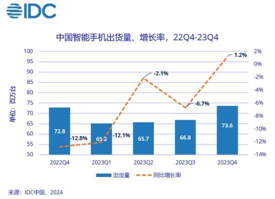 国际数据公司(IDC)最新手机季度跟踪报告显示,2023年第四季度,中国智能手机市场出货量约7363万台,同比增长1.2%,在连续同比下降10个季度后首次实现反弹。但需要注意的是,虽然整体市场终于恢复到增长趋势,但是市场表现还是明显低于预期。2023年全年中国智能手机市