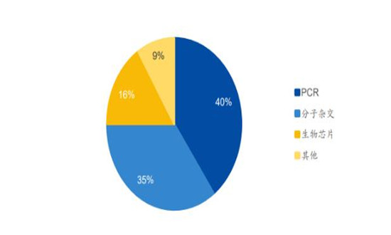 分子诊断领域主要包括 PCR(qPCR 和 dPCR)、二代测序技术(NGS)、荧光原位杂交(FISH)、基因芯片等,其中 PCR 是目前应用最成熟、市场份额最大的技术平台,在国内分子诊断中市占率为40%,在国内获批的分子诊断产品中,基于PCR技术的超过90%。