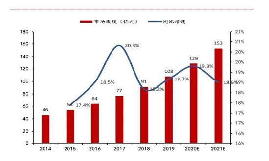 我国分子诊断因起步晚,规模较小。但在消费升级、分子诊断技术进步、政策扶持以及资本追捧等多重因素的共同推动下,我国分子诊断行业发展前景良好,增长快速。2014—2019年,我国分子诊断市场规模由46亿元增加至约108亿元,年均增速在18%左右。