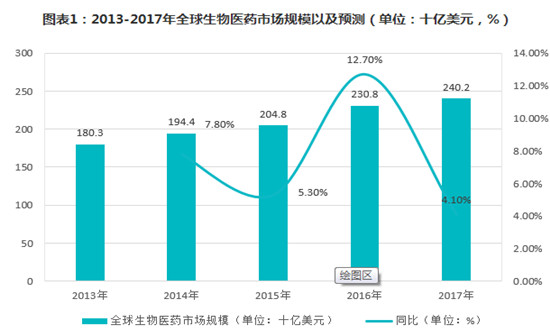 全球生物药物市场规模由2013年的1803亿美元增加至2017年的2402亿美元,复合年增长率为7.4%。