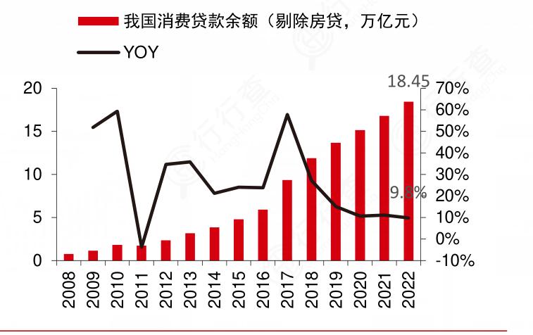 自2015年起,消费金融行业进入了一个迅速扩张的阶段。据中国银行业协会消费金融专业委员会的数据显示,不含房贷的消费金融贷款余额从2014年的4.2万亿元增长到了2022年的19万亿元。这一增长表明,消费金融行业在我国的发展势头强劲。