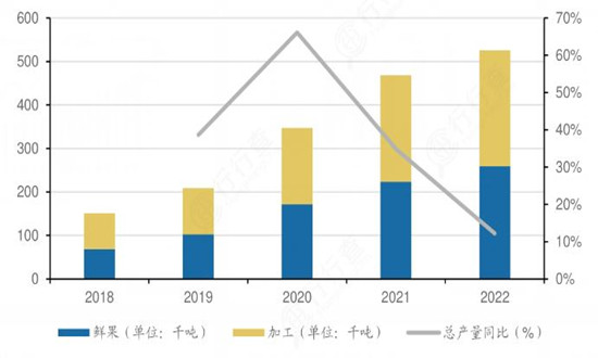 根据IBO数据,截止2022年,我国用于鲜食和加工的蓝莓合计年产量为52.53万吨,2018-2022年复合增长率36.63%,已超越美国成为世界第一大出产国。