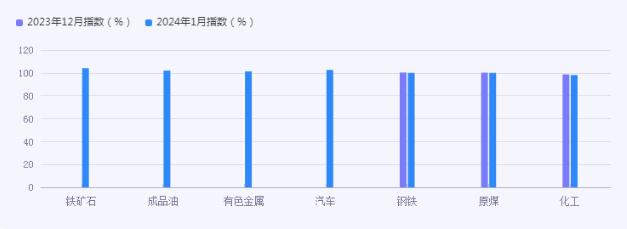 从供应端来看,商品供应增速加快。2024年1月份,大宗商品供应指数为101.4%,结束连续回调,较去年12月份回升1.1个百分点。指数显示,1月份铁矿石、成品油、供应量较去年12月份分别增加4.1%、2.2%,增速较去年12月份分别增加1.8个百分点、1.5个百分点;有色金属供应量较去年12月份增加1.4%;汽车供应量较去年12月份增加2.6%,增速较去年12月份减缓1.8个百分点;1月份钢铁、原煤和化工供应量较去年12月份分别减少0.5%、0.3%和1.2%。