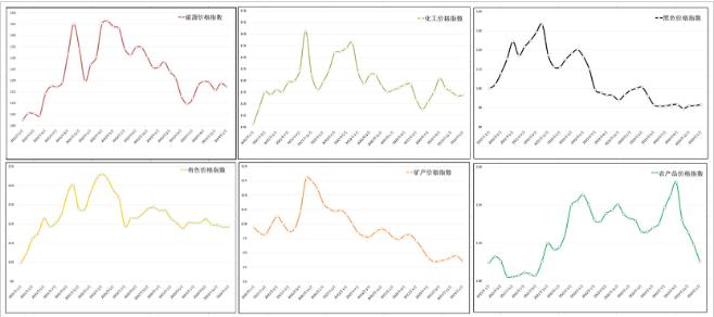 分行业看,化工、黑色和有色价格指数上涨,农产品、矿产和能源价格指数下跌。其中,化工价格指数止跌企稳,小幅回升至113.8,月环比上涨0.3%,年同比下跌1.9%;黑色价格指数连续三月上升,报91.6,月环比上涨0.4%,年同比下跌7.6%;有色价格指数低位徘徊,略有上涨,报118.4,月环比小幅上涨0.1%,年同比下跌6.7%;能源价格指数呈整荡整理走势,回落至117.4,月环比下跌1.2%,年同比下跌6.9%;矿产价格指数下挫,报2021年1月以来低点86.9,月环比下跌2.2%,年同比下跌8.8%;农产品价格指数再创新低,报105.2,为近24个月低点,月环比下跌4%,年同比下跌9.7%。