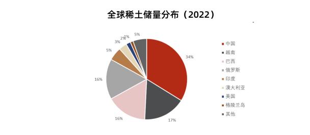 而涉及稀有金属行业,就不得不提到稀土,可以说,我国在稀土产业占有极大的优势。从储量看,2022年全球稀土储量约1.3亿吨,中国稀土储量世界第一,为4400万吨,占比34%;从产量看,2022年全球稀土产量约30万吨,中国产量21万吨,占比70%,同样为世界第一。