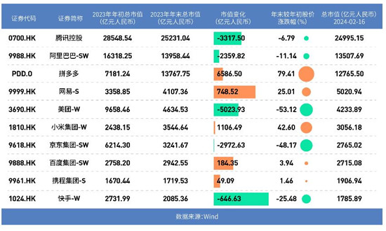 2023年,中国十家头部互联网企业市值的急剧分化。十家互联网大厂包括美团、腾讯控股、京东集团、阿里巴巴、快手、携程集团、百度集团、网易、小米集团和拼多多。市场数据显示,10家企业2023年初总市值为80878.42亿元,年末总市值为75232.87亿元,市值整体小幅下滑。