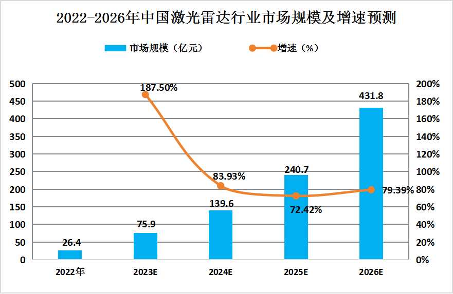 展望未来,中国激光雷达市场将呈现出快速增长的态势。报告预测,从2022年至2026年,中国激光雷达市场规模将保持强劲增长,从26.4亿元迅速增长至431.8亿元。预计年均复合增长率将达到惊人的101.1%。