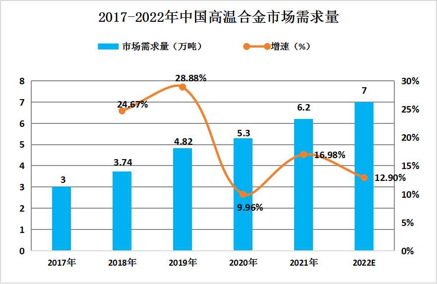 据统计,我国高温合金的需求量从2017年的3万吨迅速增长到了2020年的5.3万吨,年均复合增长率高达20.89%。这一增速不仅展现了我国高温合金行业的强劲势头,也反映了我国在关键材料领域的创新能力正在快速提升。而根据预测,到了2022年,我国高温合金的需求量将进一步增长至7万吨,这一数字背后是巨大的市场潜力和广阔的发展前景。