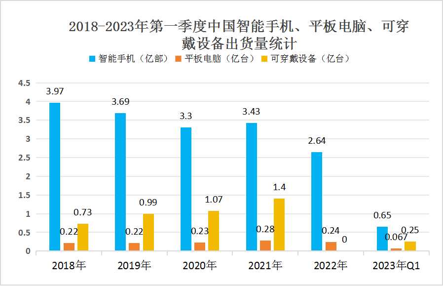 到了2023年第一季度,中国智能手机市场的出货量约为6544万台,同比下降了11.8%。在市场份额上,OPPO、苹果、vivo、荣耀和小米占据了前五的位置。而平板电脑市场的出货量约为669万台,同比下降约1.1%。相比之下,可穿戴设备的出货量达到了2471万台,其中手环市场率先回暖,显示出强劲的增长势头。