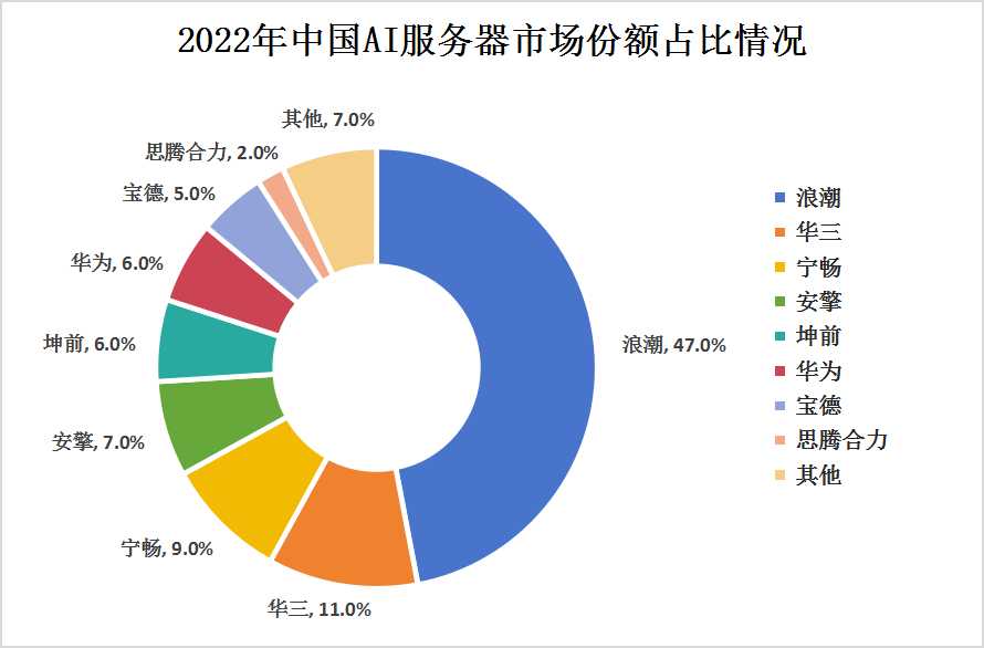 尽管国外AI芯片厂商在全球市场上占有一定的垄断地位,但中国的AI服务器水平已经跻身世界前列。这得益于中国在人工智能领域的持续投入和创新努力。据统计,2022年我国AI服务器市场呈现出激烈的竞争态势。其中,浪潮以46.6%的市场份额占据首位,显示出其在国内市场的领先地位。新华三和宁畅分别以11%和9%的市场份额紧随其后,位列第二和第三名。