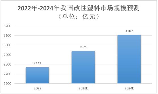 随着改性塑料技术的进步和改性塑料应用的推广,改性塑料市场规模也不断增大。中国改性塑料市场规模在2022年约为2771亿元,同比增长6.44%。据中研普华产业院研究报告《2024-2029年改性塑料产业现状及未来发展趋势分析报告》预测,2024年将达3107亿元。