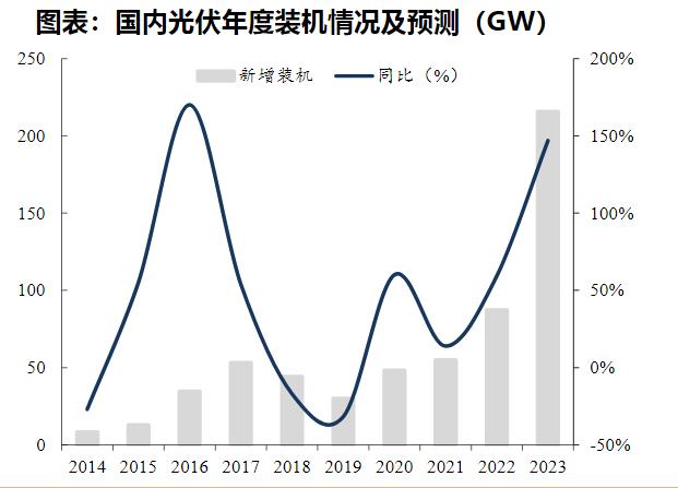 国家能源局发布风光新增装机目标,24年增速或将放缓。2023年12月,国家能源局发布24年全年目标风光新增装机200GW(为最底线水平)。2023年光伏新增装机爆发式增长,全年光伏装机215.75GW,同增147%。高增速奠定高基数,考虑电网消纳压力,我们预计2024年国内光伏新增装机略增。