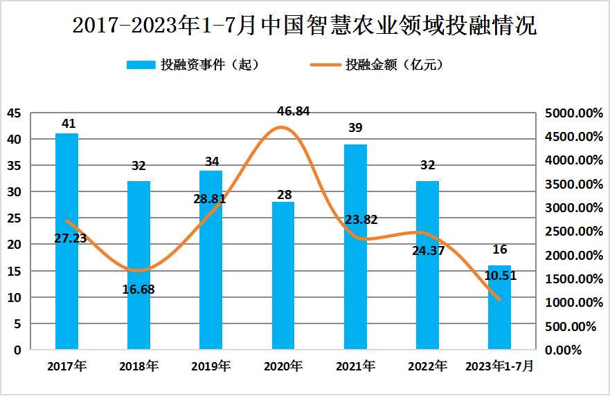 图表:2017-2023年1-7月中国智慧农业领域投融情况