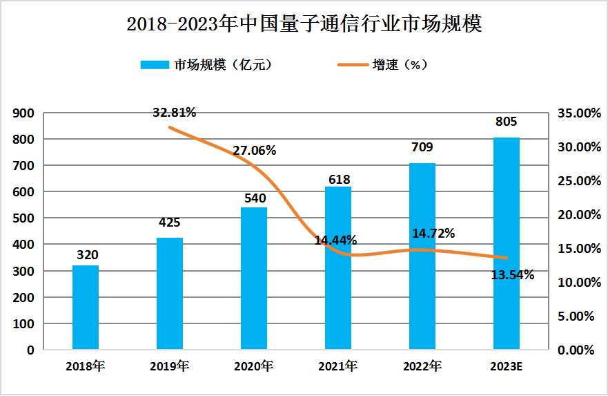 在国家战略的指引下,量子通信行业也迎来了快速发展的黄金时期。据中研产业研究院《2023-2027年中国量子通信行业现状分析及发展趋势报告》分析,我国量子通信市场规模由2018年的320亿元增长至2022年的709亿元,年均复合增长率高达22%,这一增长速度在全球范围内都是罕见的。这一增长主要得益于国家政策的支持和市场需求的不断增长。随着量子通信技术的不断突破和成熟,其在政务、金融、电力等多个行业和领域的应用也越来越广泛,市场需求呈现出爆发式增长。