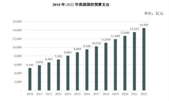 随着我国在经济建设方面不断取得进步,国家在国防领域的财政支出也在不断增长以适应新国际国内形势下的国家安全需求。根据财政部的统计,“十三五”军费预算支出较“十二五”期间增幅近50%,我国2022年军费预算为1.45万亿元,较2021年增长了7.02%,连续六年超万亿元。