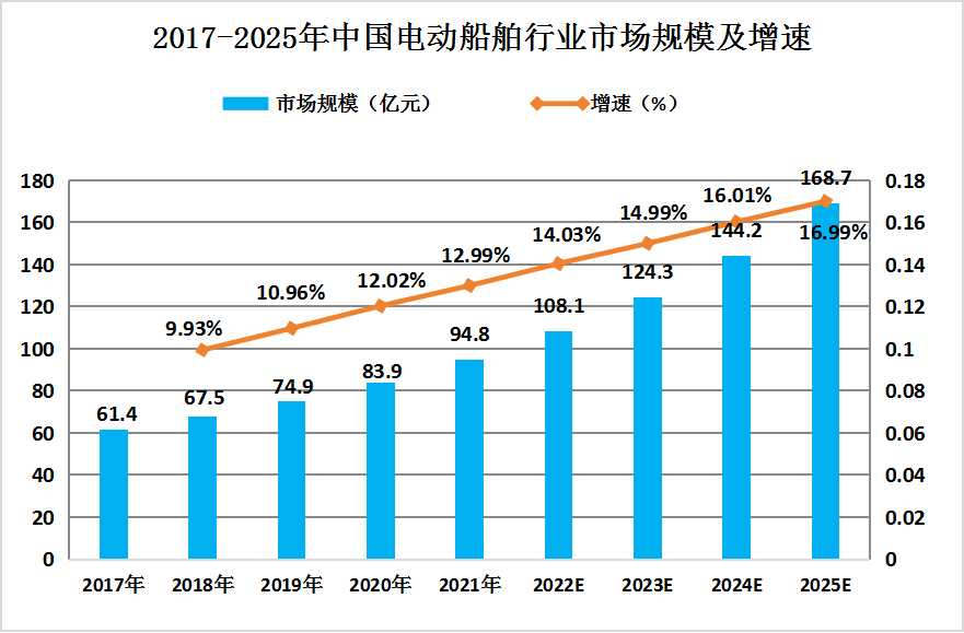 图表:2017-2025年中国电动船舶行业市场规模及增速