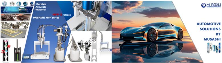 武藏作为流体控制领域的前沿品牌,拥有完备的点胶产品线,以及在超微量、高精尖点胶领域很高的市场占有率。随着近年全球需求的变化,其产品更多地被运用于汽车电子、自动驾驶、航天科技、尖端半导体、生物医疗等前沿科技领域,尤其在新能源汽车制造领域中,武藏凭借独创性的产品设计,已在诸如高粘度散热胶、无溶剂Coating、高精度CIPG等关键工艺上实现了诸多技术突破,并为全球客户带来了巨大收益。