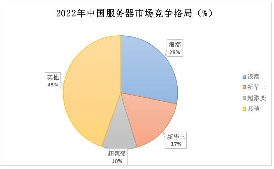 从市场竞争格局来看,中国AI服务器呈现三足鼎立的格局。据IDC数据显示,2022年中国服务器市场份额中,浪潮份额为28.1%,新华三为17.2%,超聚变则为10.1%,这三家公司也成为了2022年市场份额唯一达到两位数的品牌。