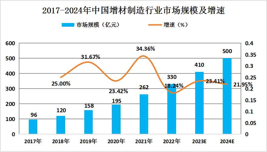 图表:2017-2024年中国增材制造行业市场规模及增速