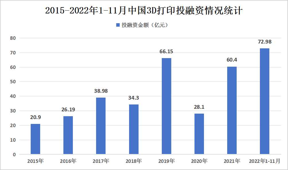 如今,随着技术的不断进步和市场的日益成熟,中国增材制造行业已经取得了显著的成就。市场呈现出快速增长的趋势,吸引了越来越多的投资者关注。2021年,我国3D打印市场共发生了46起投融资事件,投融资金额达到了60.4亿元。而到了2022年的前11个月,这一数字更是有所攀升,共发生了35起投融资事件,投融资金额完成72.98亿元。