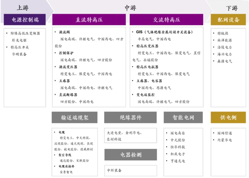 特高压相关产业链可以分为上游的电源控制端、中游的特高压传输线路与设备、下游的配电设备。