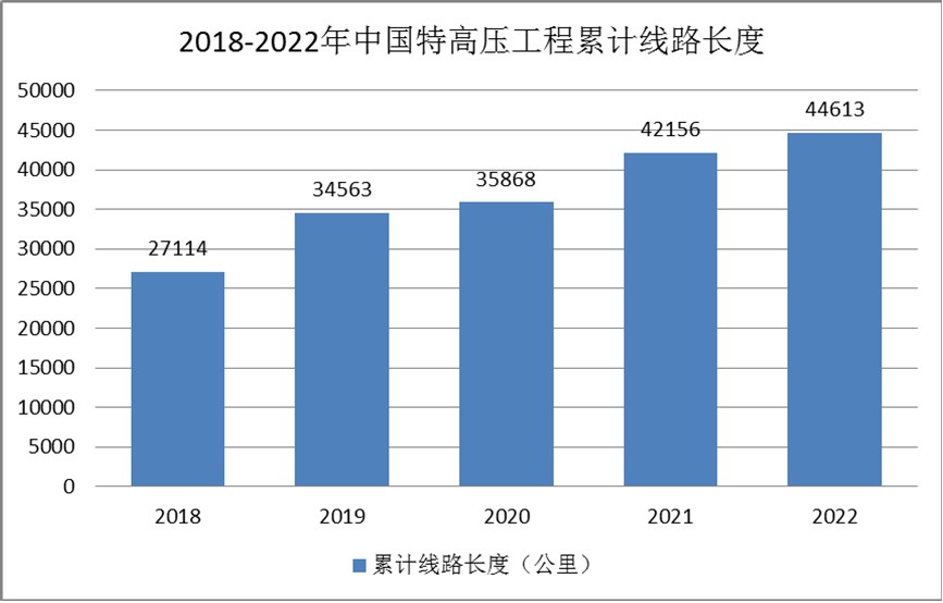 特高压跨区输电能缓解我国电力资源与负荷不均的难题,近年来我国特高压工程建设发展迅速。数据显示,2022年特高压工程累计线路长度约达44613公里。