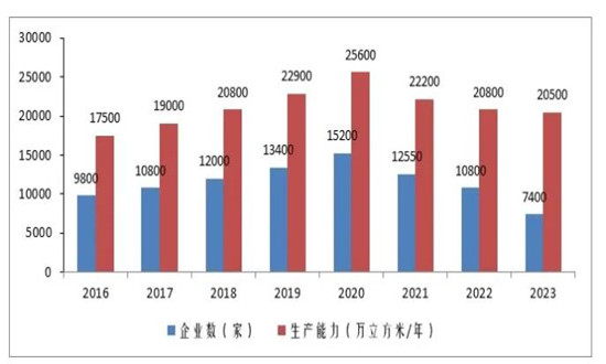 从生产工艺的角度来看,胶合板行业的发展与多项关键技术的突破密不可分。例如,旋切机的发明使得木段可以高效旋切成薄木片,为胶合板的大规模生产奠定了基础。而合成树脂的发明则替代了传统的蛋白胶,大大提高了胶合板的性能和生产效率。这些技术的不断进步为胶合板行业的发展注入了强大的动力。2023年底,全国保有胶合板类产品生产企业7400余家,总生产能力约2.05亿立方米/年,在2022年底基础上进一步降低1.4%;企业平均生产能力约2.77万立方米/年·家。
