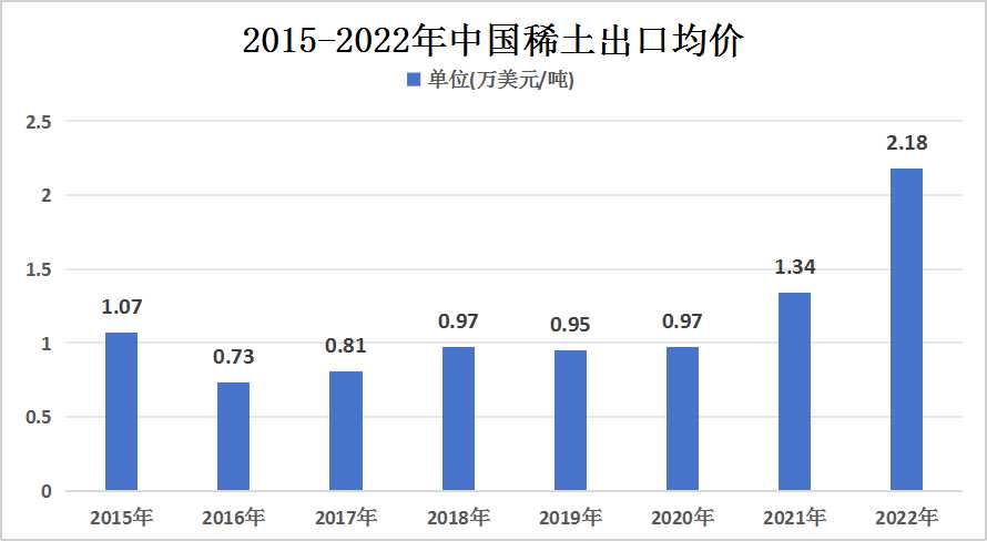 2022年,中国稀土出口均价达到了2.18万美元/吨,相较于2021年的1.34万美元/吨有了显著的提升。这一变化不仅反映了稀土资源价值的不断提升,也凸显了我国在全球稀土市场中的主导地位和议价能力的提升。