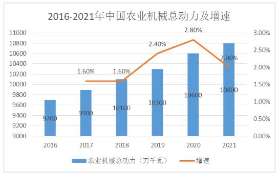 图表:2016-2021年中国农业机械总动力及增速