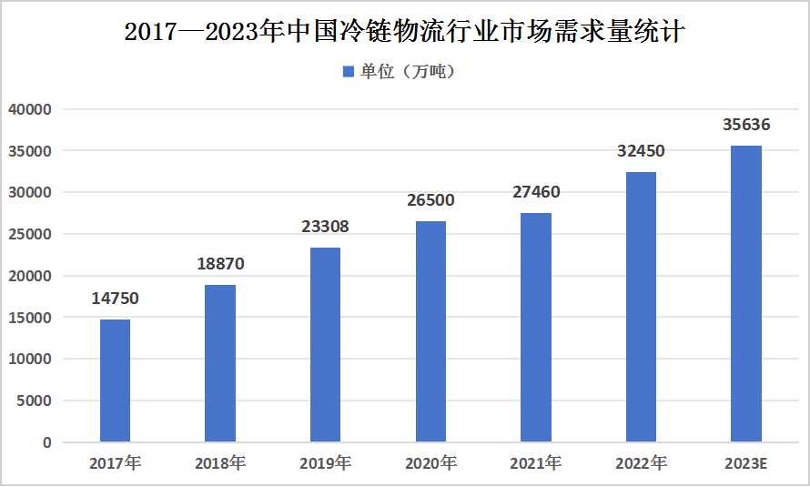 图表:2017—2023年中国冷链物流行业市场需求量统计