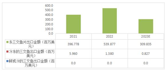 图表:2021-2023年中国三文鱼出口金额情况