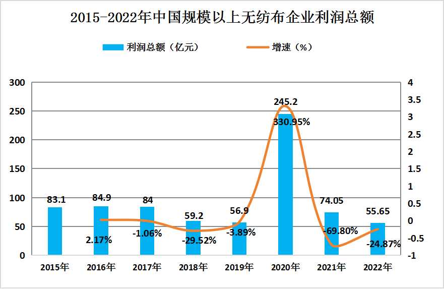 进入2022年,无纺布行业依然面临着较大的挑战。在多重因素的影响下,非织造布行业承压运行,规模以上企业的利润总额为55.63亿元,同比下降了24.87%。与此同时,营业收入也同比下降了0.7%,表明整个行业在经营上面临着较大的困难。