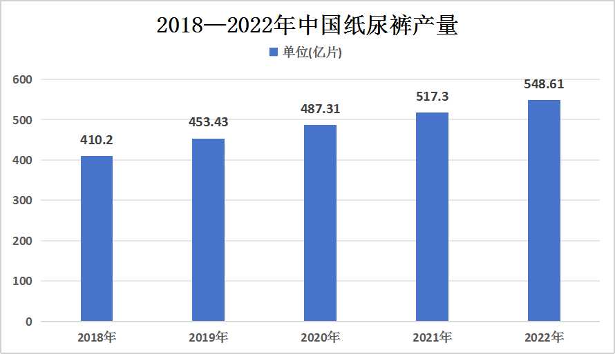 据中研普华研究院撰写的《2024-2029年中国婴儿纸尿裤行业市场深度调研及投资策略预测报告》数据统计,在2018年至2022年期间,我国纸尿裤产量实现了跨越式的增长。从最初的410.2亿片起步,逐年攀升,至2022年已达到548.61亿片的规模。这一增长并非偶然,而是得益于生产技术的不断创新和升级,以及市场需求的持续拉动。